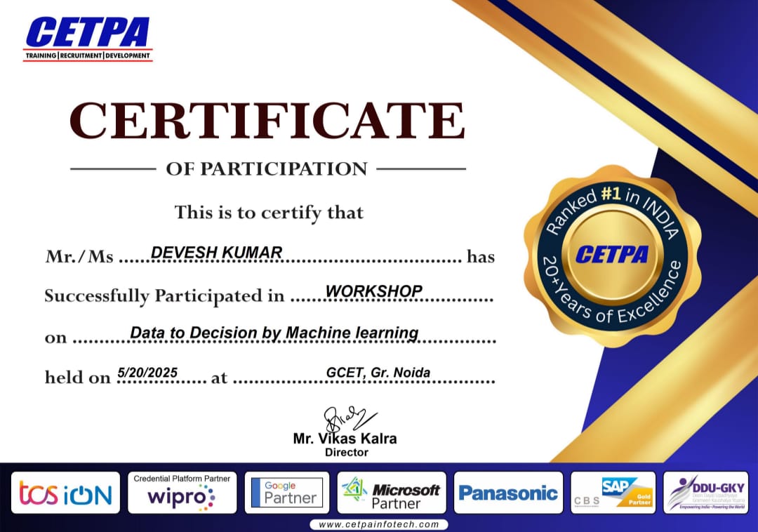 Successfully participated in a specialized workshop, gaining practical exposure to the principles and implementation of Machine Learning models for data-driven decision-making.